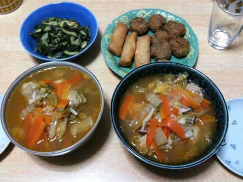左下はカキフライ、その右はチーズサラミたっぷりサラダ、両端は野菜スープです。