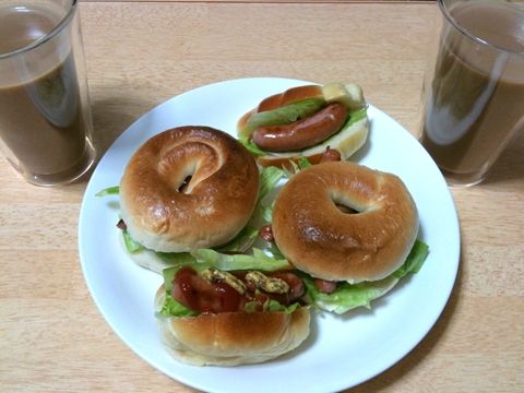 ぴっかりさんが焼いたロールパンとベーグルに、レタスときゅうりとウインナーをはさみました。