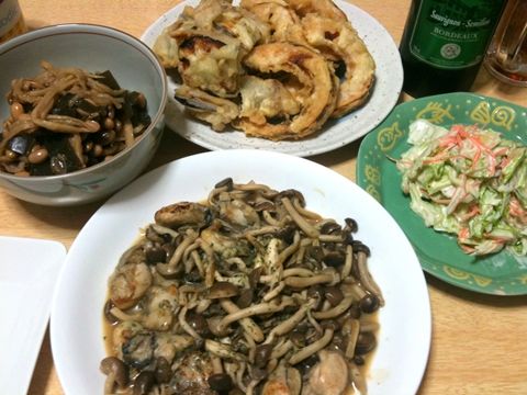 今日の晩御飯は豆と昆布と切り干し大根の煮物、カキとシメジのバターソテー、ナスと豚肉とカボチャの天ぷら、シーザーサラダです。