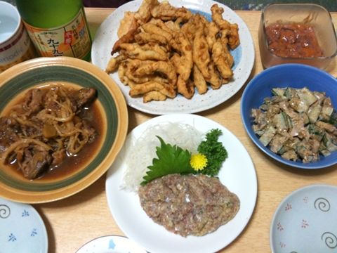 下のお皿は中華クラゲとキュウリの和え物、右のお皿はカキフライ&タルタルソースです。