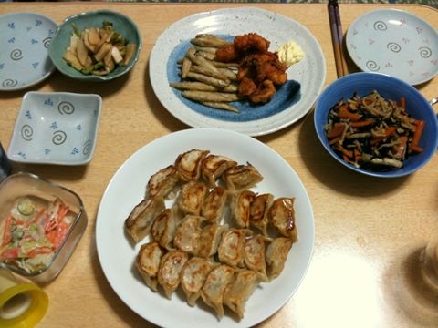 餃子、わかさぎとタコのから揚げ、大根切り干しの煮物、他