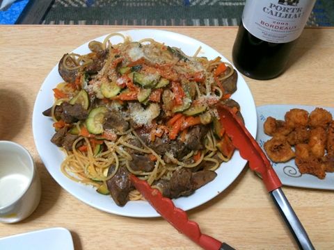 レバーたっぷりパスタとタコの唐揚げ