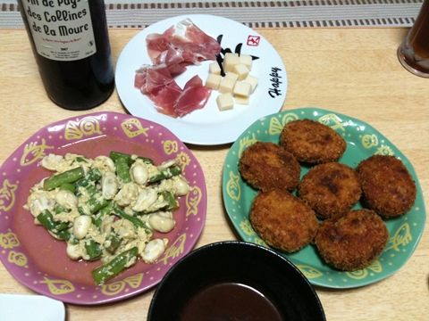 コロッケとワインソース、マッシュルームといんげんのオリーブオイル炒め