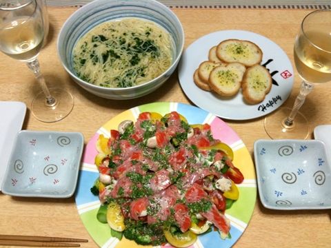 サーモンと野菜のカルパッチョ、冷製パスタ