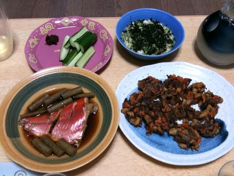 きんめの煮付けと牛筋の揚げ物他