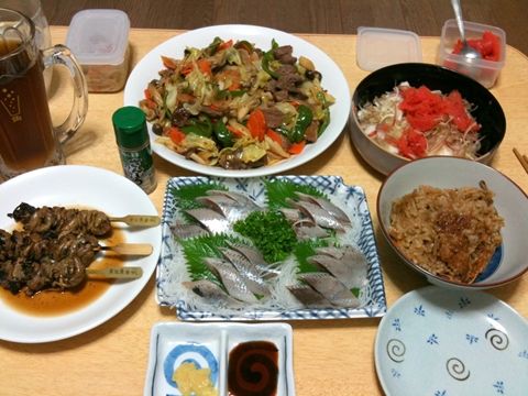 炒め物のお肉は何だったかな?炊き込みご飯はなんかの汁で炊いたらしいけど何だっけ? 刺身はいわしだったっけかなぁ?