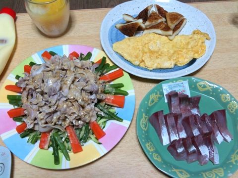 豚肉サラダとお刺身とはんぺんと卵焼き
