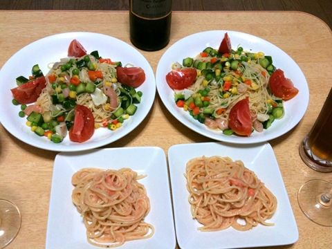 でも普通の太さのパスタ(1.6mm前後のスパゲティかな)が二人分作るには足りなくて、それで別のパスタ(カッペリーニという0.9mmの極細のスパゲティ)を使って冷製パスタも作ったそう。