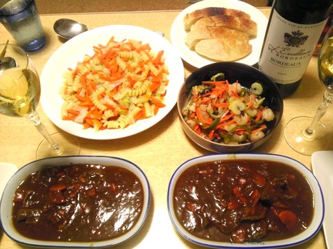 本日のメニューは、タン&ハツシチュー、自家製フランスパン、フィジッリのアンチョビパスタ、海鮮サラダ、です。