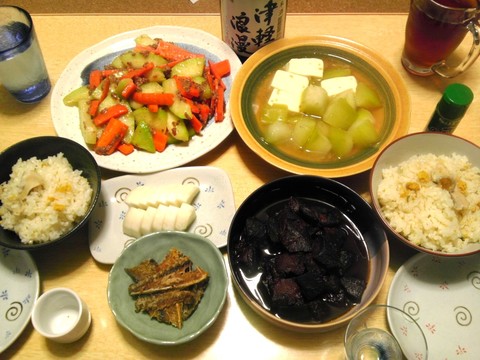 本日のメニューは、いちご煮炊き込みご飯、冬瓜とにんじんの肉みそ炒め、冬瓜と豆腐のくず煮、牛タンのしぐれ煮、アジの骨せんべい、大根の自家製ぬか漬け、です。