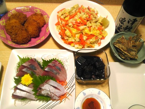 にんじんとキャベツの玉子炒め、イナダの刺身、他