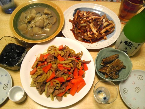 本日のメニューは、豚肉入りレンコンのきんぴら、牡蠣と里芋の煮物、イカのゴロ焼き、です。