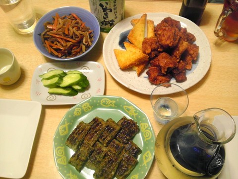 本日のメニューは、鶏の唐揚げ、ハンペンのチーズはさみ揚げ、切干し大根とにんじんとヒジキの煮物、ハンペンとレンコンのうなぎの蒲焼きもどき、キュウリのぬか漬け、です。