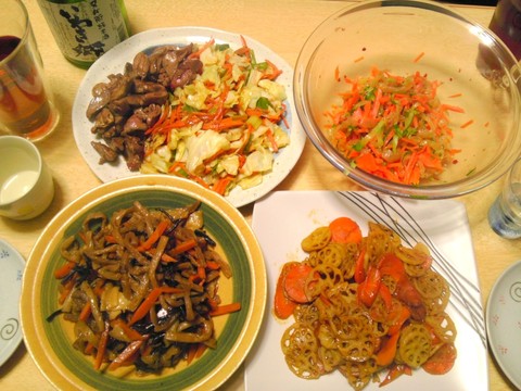 レンコンとにんじんのきんぴら、キャベツのマヨネーズしょう油炒め、他 本日のメニューは、レンコンとにんじんのきんぴら、キャベツのマヨネーズしょう油炒め、鶏レバーの塩コショウ焼き、中華クラゲのサラダ、です。