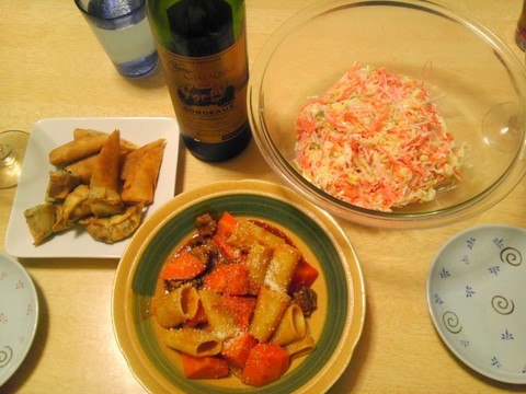 本日のメニューは、にんじんとパスタのトマトソース煮込み、コールスローサラダ、春巻き、揚げ餃子、です。