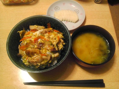 本日のメニューは、他人丼、ジャガイモのみそ汁、自家製大根のぬか漬け、です。