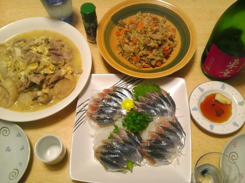 卯の花、サンマの刺身、牛肉の卵とじ
