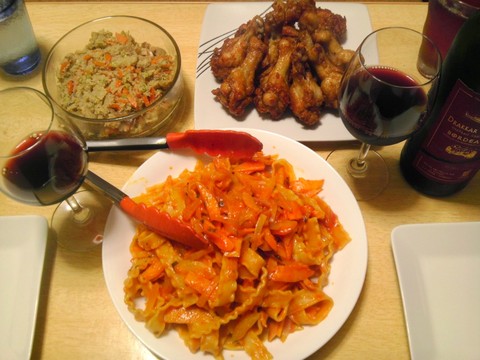 本日のメニューは、鶏の唐揚げ、ナポリタン風パスタ、昨日の残り物、です。