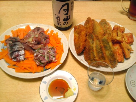 アジとにんじんのフライ、アジの刺身3種盛り 本日のメニューは、アジとにんじんのフライ、アジの刺身3種盛り、です。 今日もぴかさんは仕事から帰ってきてアジを一生懸命さばいていました。 いただいたアジは超新鮮だったため、今日もお刺身でいけます