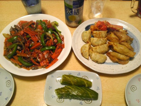 揚げ餃子と鶏皮餃子、レバーと野菜の炒め物、他 本日のメニューは、揚げ餃子と鶏皮餃子、レバーと野菜の炒め物、キュウリのぬか漬け、です。 今日はアジは食卓に出てきませんでしたが、今日も含め、ぴかさんは3夜連続でアジをさばき続けてやっと処理が終わったようです。お疲れ様でした