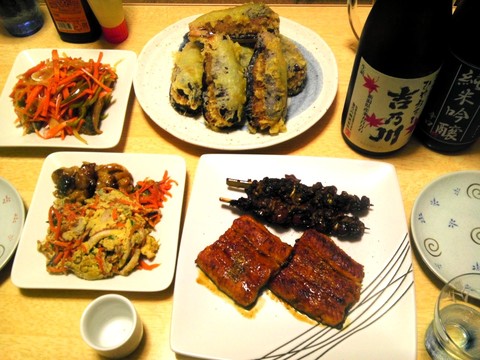 ナスのはさみ揚げ、うなぎの蒲焼きとうな肝焼き、他