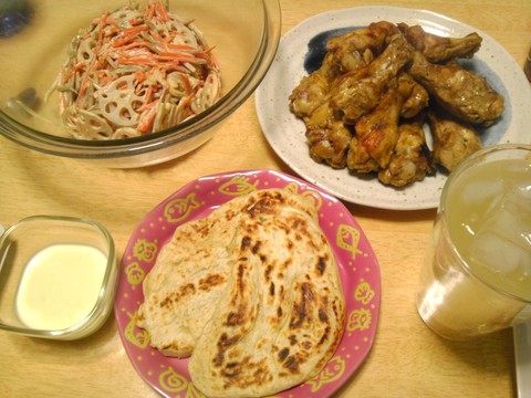 本日のメニューは、タンドリーチキン、ナン、根菜のゴマサラダ、です。
