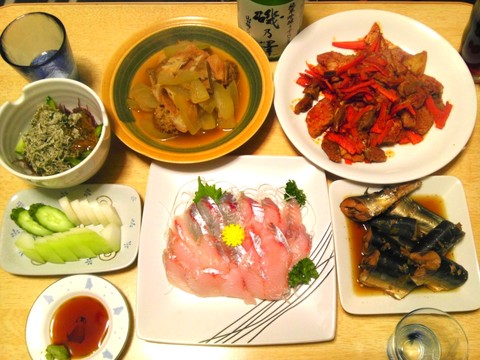 本日のメニューは、ホウボウの刺身、アジと麩の冬瓜煮、豚キムチ砂肝入り、サンマの煮付け、のげのりの酢の物、自家製ぬか漬け、です。