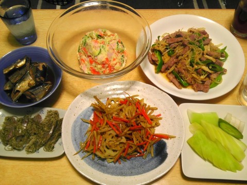 本日のメニューは、きんぴらごぼう、ポテトサラダ、ホウボウのとろろ昆布締め、豚肉のポン酢炒め、冬瓜のぬか漬け、サンマの煮付け、です。