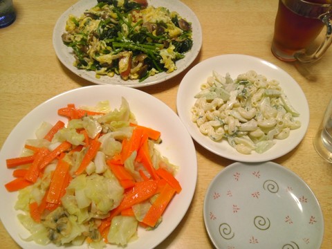 キャベツと魚介のアンチョビ炒め、ホウレン草とコーンの玉子炒め、ぬか漬けのマカロニサラダ
