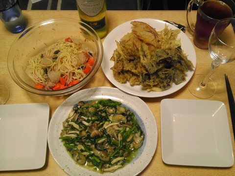 本日のメニューは、牡蠣と春菊のガーリックオイル炒め、冬瓜とにんじんの温サラダ、ごぼう、玉ねぎ、舞茸、昆布のフリッター、です。