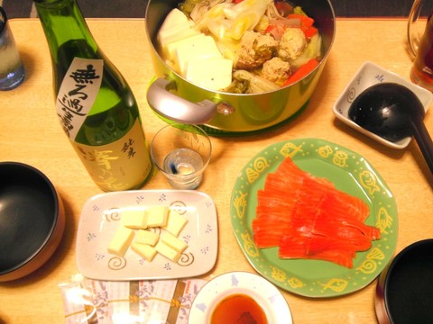 本日のメニューは、鶏鍋、サーモンの刺身、チーズといぶりがっこ、です。