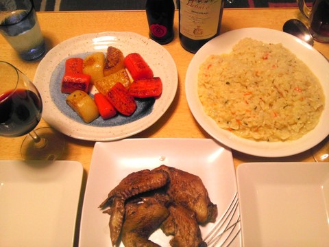 本日のメニューは、鶏手羽先のワイン煮、にんじんと大根のソテーバルサミコがけ、ブルーチーズのリゾット、です。