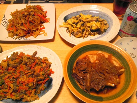 本日のメニューは、ちりめんじゃことぬか漬けのキンピラ、具だくさんうの花、肉豆腐、ヒラタケの玉子炒め、です。