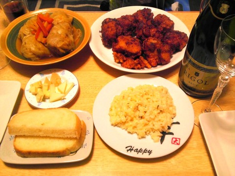 ロールキャベツ、鶏の唐揚げ、リゾット、他