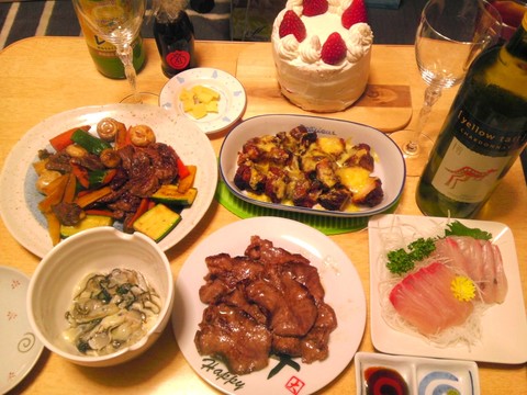 本日のメニューは、生牡蠣、タン塩、カンパチの刺身、鶏唐揚げのチーズ焼き、ハラミの野菜炒め、バースデーケーキ、です。