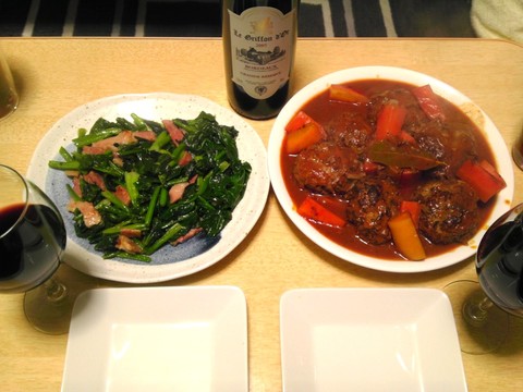 煮込みハンバーグ、ベーコンとホウレン草のソテー