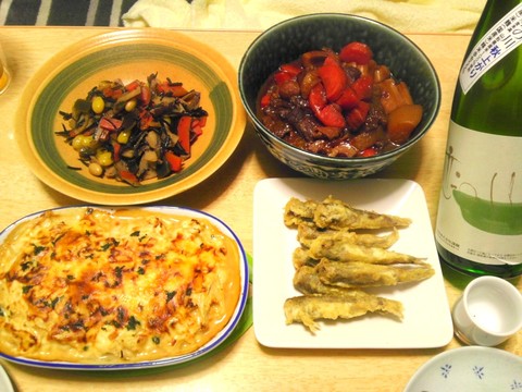 洋風鍋、牛たんとごぼうの天ぷら、他