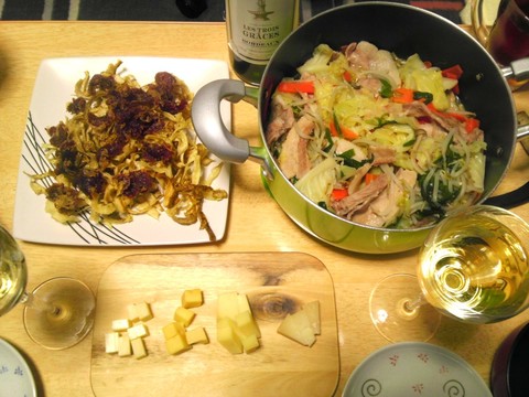本日のメニューは、洋風鍋、牛たんとごぼうの天ぷら、チーズ各種、です。