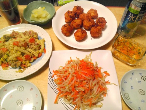 写真左のお皿は昨日の洋風卯の花の残りを使って、パスタと和えたものです。おからとパスタがとてもよく合っていておいしかったので、かなり食べ過ぎて後でものすごくお腹が苦しくなってました「(^^; )