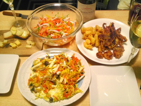 イカ料理各種 さて、サバに当たったぴかさんも全快し、今日はイカ料理だらけとなりました。 本日のメニューは、イカのフリッターとゲソ揚げ、イカとにんじんの玉子炒め、イカのマリネサラダ、チーズ各種と自家製パン、です。