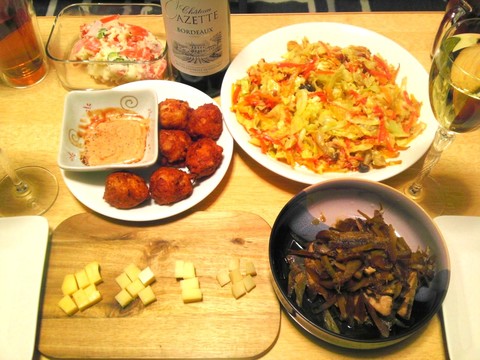本日のメニューは、チキンナゲット、にんじんとキャベツの玉子チーズ焼き、ブリごぼう、ポテトサラダ、チーズ各種、です。
