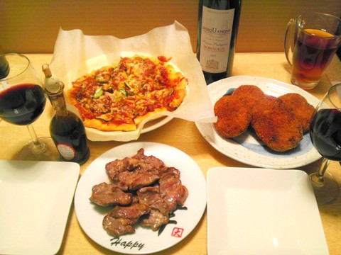 ピザ、コロッケ、羊肉のソテー