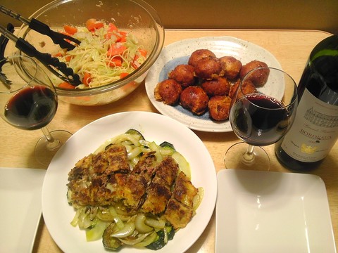 レバーのミラノ風カツレツ、ズッキーニ玉ねぎ添え、他 本日のメニューは、レバーのミラノ風カツレツ、ズッキーニ玉ねぎ添え、チキンナゲット、キャベツとにんじんのツナサラダ、です。 下のお皿は、レバーにチーズを挟んで焼いたものです。