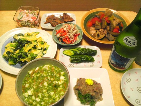 本日のメニューは、味噌仕立ての筑前煮、アジのなめろう、ターサイの玉子炒め、サバ入りなます、長芋とメカブのなめ茸和え、キュウリのぬか漬け、です。