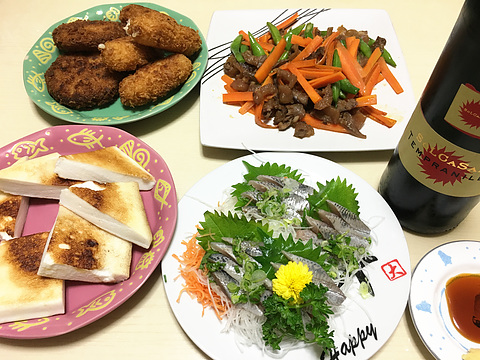 本日のメニューは、上段左からメンチカツとクリームコロッケ(既製品を揚げたもの)、牛すじとにんじんとインゲンのたれ炒め、下段左からはんぺんのバター焼き、イワシの刺身、です。