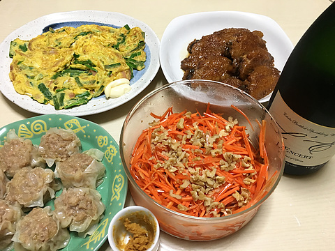 本日のメニューは、上段左からハムカツ入りニラ玉、手羽先の黒酢煮、下段左から手作り海鮮シュウマイ、にんじんの塩麹ドレッシングラペ、です。