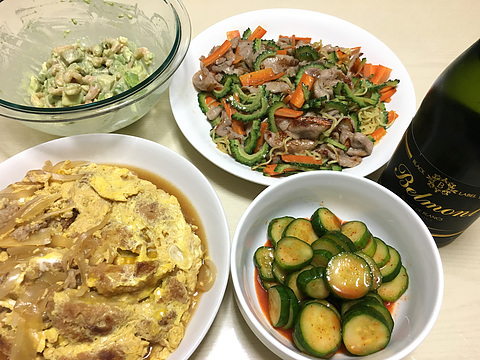 アボカドとカクテルシュリンプのわさび醤油マヨネーズ和え、他 本日のメニューは、上段左からアボカドとカクテルシュリンプのわさび醤油マヨネーズ和え、ゴーヤの塩焼きそば、下段左から余った揚げ物の玉子とじ、きゅうりのキムチ漬け、です。