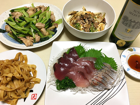 本日のメニューは、上段左から鶏肉と小松菜の焼き肉のたれ炒め、イワシ缶とミョウガとオクラの変わりやっこ、下段左から肉みそパスタ、刺身盛り合わせ、です。