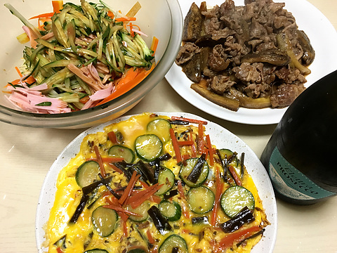 本日のメニューは、上段左からラーメンサラダ、牛肉とナスの焼き肉風、下段が漬け物ステーキ、です。