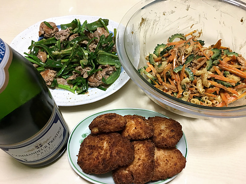 本日のメニューは、上段左から豚肉とピーマンの胡麻だれ炒め、にんじんとゴーヤのツナパスタのりマヨサラダ、下段がチキンカツ(既製品を揚げたもの)、です。